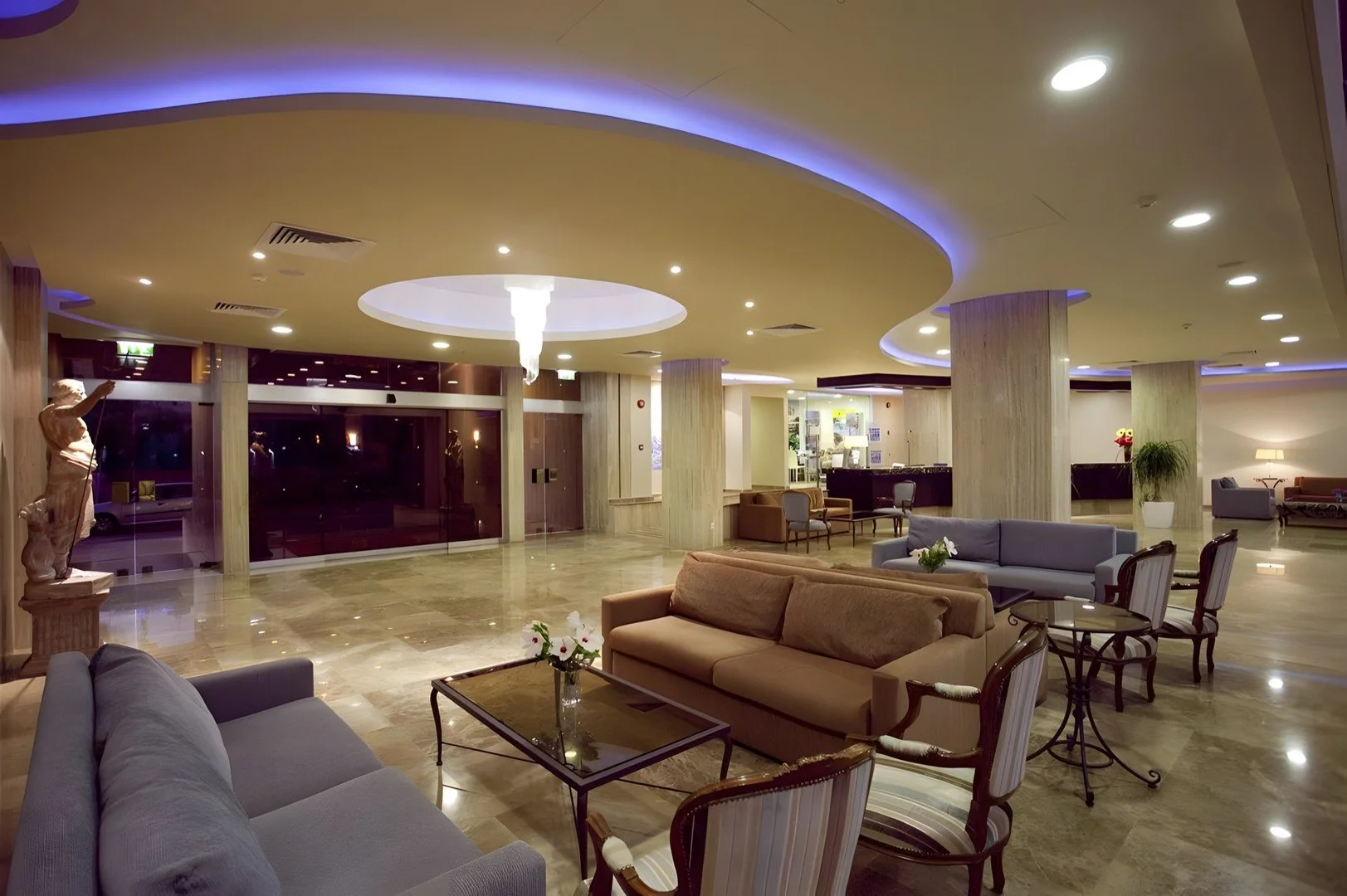 neljatärni, ehitatud 1978. aastal, renoveeritud 2014. aastal, 138 tuba, 1 hoone, 7 korrust, 2 lifti, fuajee, ööpäevaringne vastuvõtt, 2 restorani: peamine Poseidon – toidud Rootsi lauas ja à la carte, rahvusvaheline köök, temaatilised õhtud, saadaval laste kõrged toolid, taimetoidud, Aegean Coffee Shop – toidud Rootsi lauas ja à la carte, rahvusvaheline köök, saadaval laste menüü, taimetoidud, 3 baari, sealhulgas basseini ääres ja ranna ääres; butiik, suveniiripood, parkimine; konverentsikeskus maksimaalselt 350 inimesele, tasuta traadita internet; tasu eest: toatootmine, pesumaja, triikimisteenus, jalgrattalaenutus (välised pakkumised); aktsepteeritud krediitkaardid: Visa, MasterCard.
