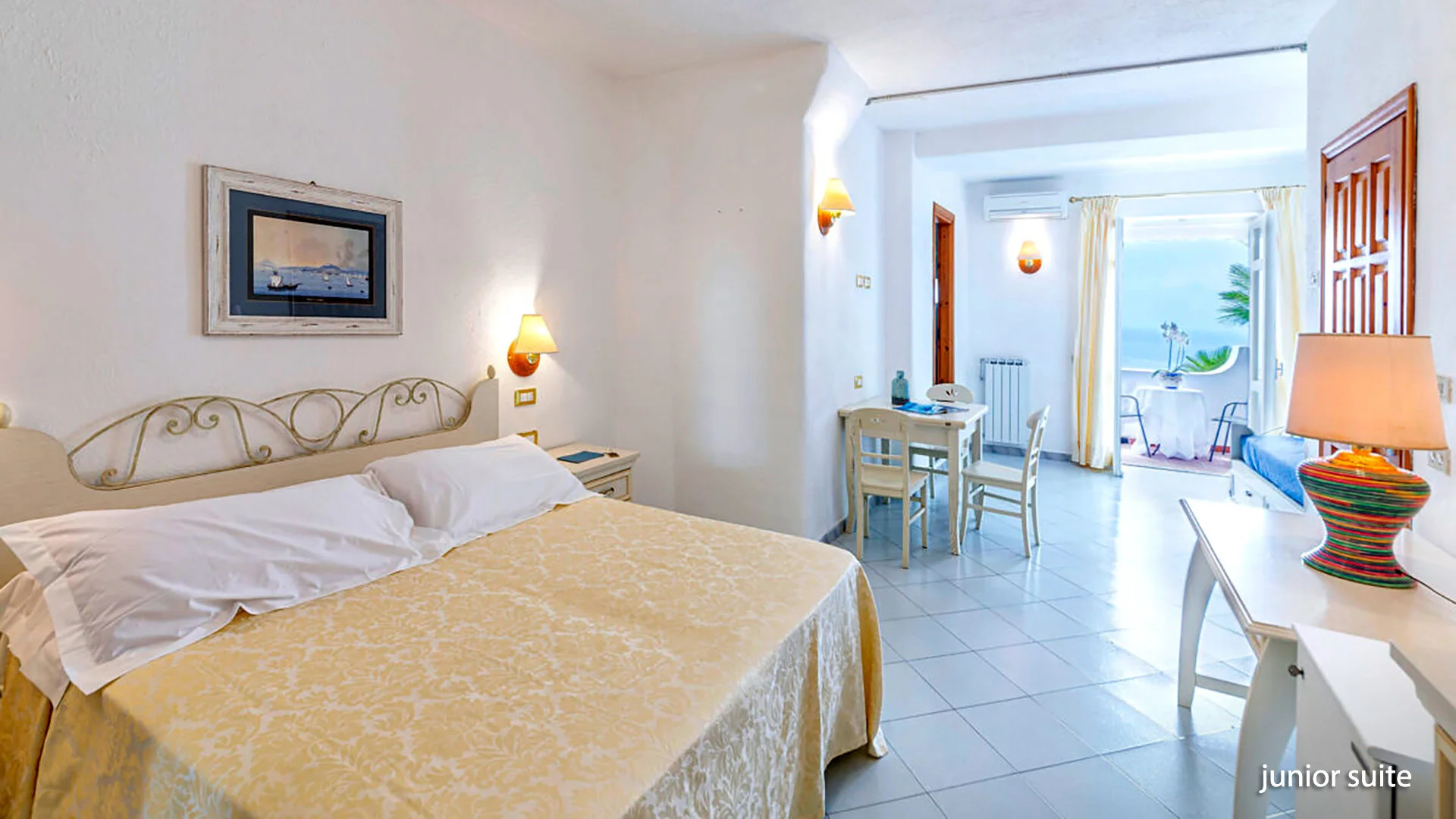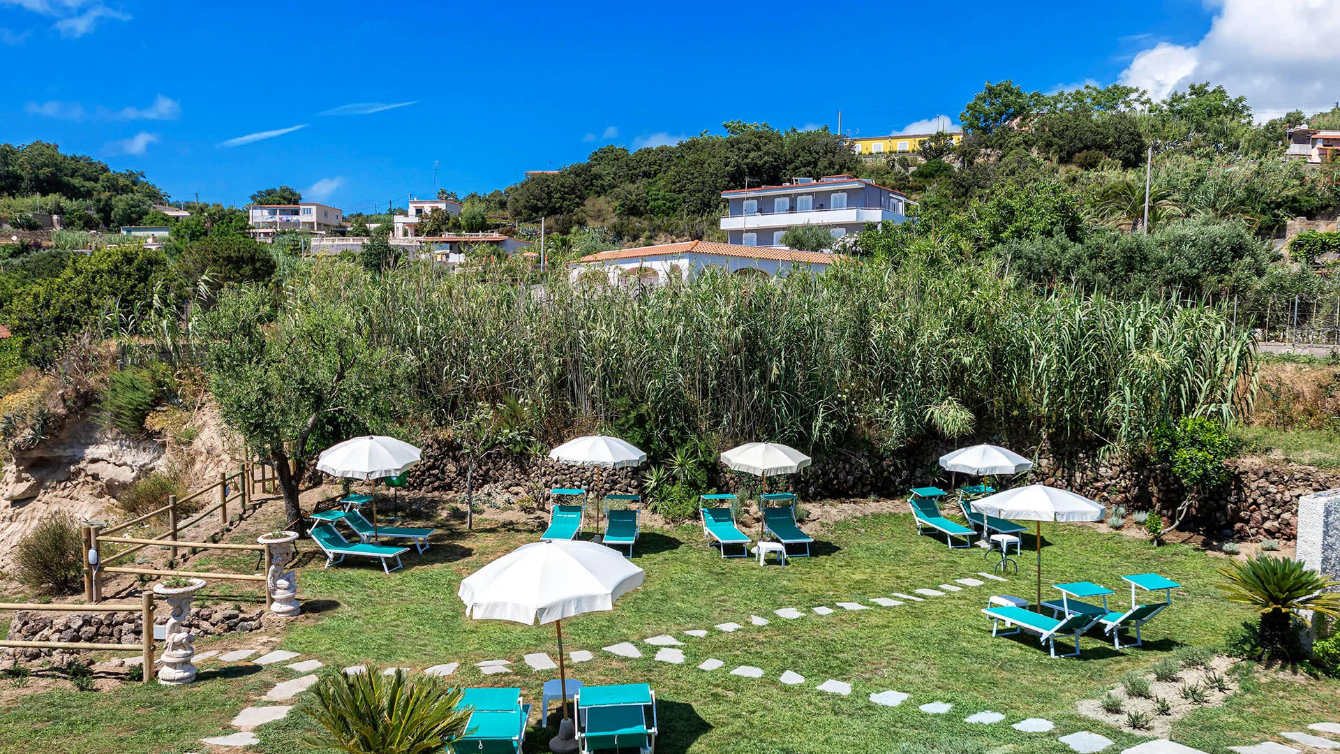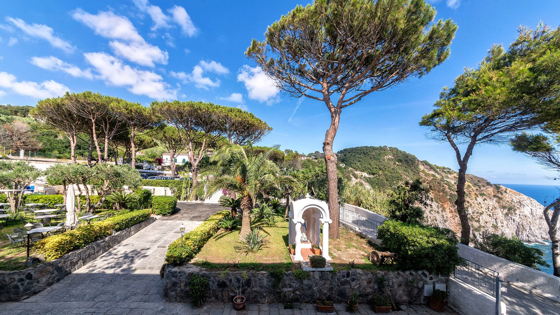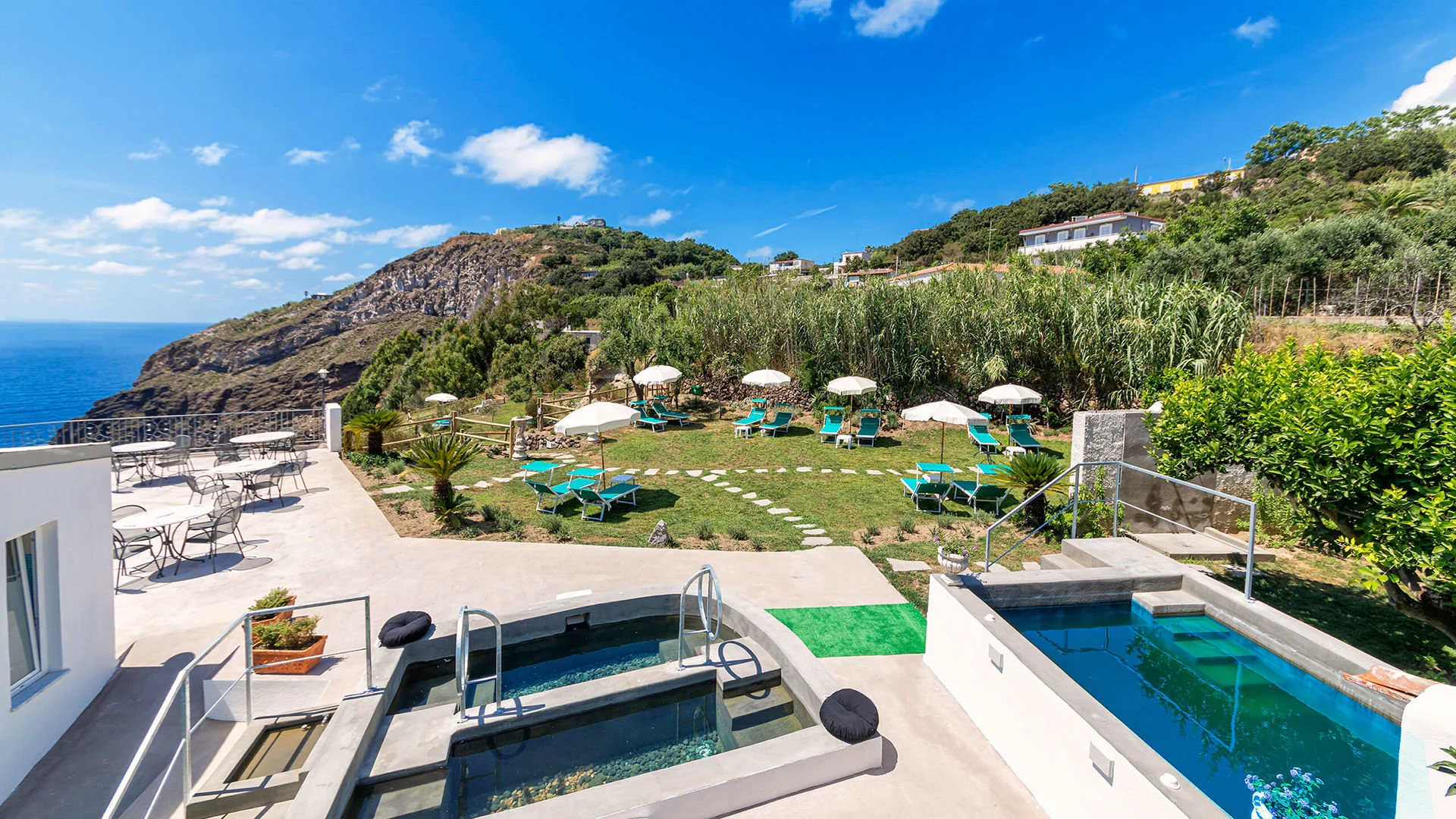 kaljul, u. 5,5 km kaugusel FORIO keskusest, u. 1,3 km kaugusel poodidest ja baaridest, u. 6 km kaugusel Forio sadamast, u. 3,5 km kaugusel Giardini Ravino botaanikaaiast, u. 4 km kaugusel Giardini Poseidon Termest - saare suurimast termipargist 20 basseiniga; u. 52 km kaugusel Napoli lennujaamast (transport bussi/minibussi ja parvlaevaga); tasuta hotellibuss Forio kesklinna (graafikujärgselt).